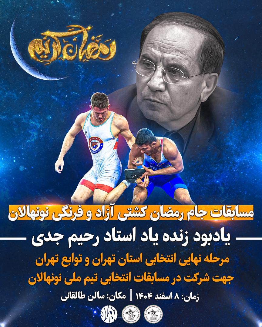 به گزارش سایت هیئت کشتی تهران، مرحله نهایی انتخابی کشتی آزاد و فرنگی نونهالان استان تهران و توابع جهت شرکت در انتخابی تیم ملی، به همت هیئت کشتی استان در قالب جام رمضان روز هشتم اسفند ماه در سالن طالقانی شهرری به انجام خواهد رسید.